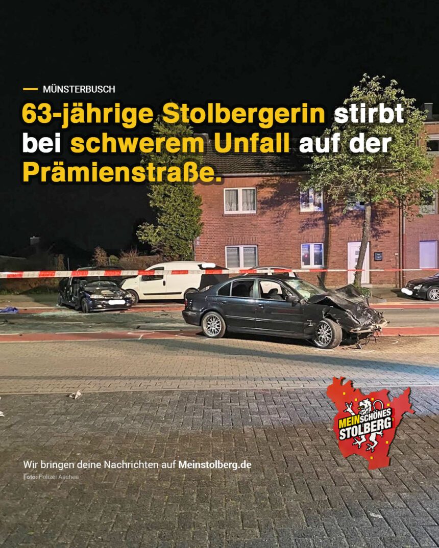 Im Kreuzungsbereich Prämienstraße / Meisenweg kam es zum Zusammenstoß zweier Fahrzeuge. Die Fahrerin des einen PKWs, eine 63jährige Stolbergerin, erlitt durch den Zusammenstoß so schwere Verletzungen, dass sie trotz unverzüglich eingeleiteter Rettungsmaßnahmen noch am Unfallort verstarb.