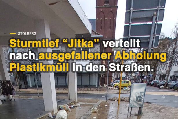 Sturmtief „Jitka“ verteilt nach ausgefallener Abholung gelbe Säcke und Plastikmüll in den Straßen