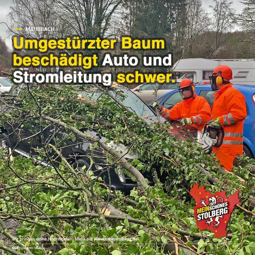 Umgestürzter Baum beschädigt Porsche und Stromleitung