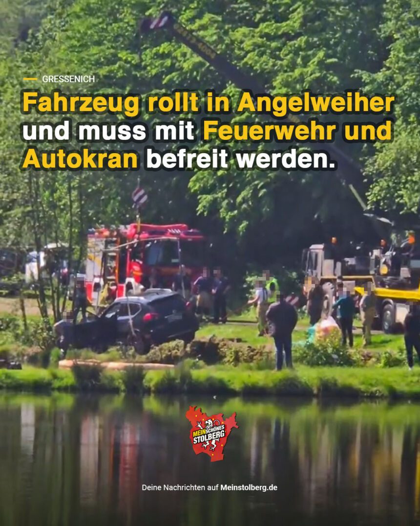 Während die meisten Stolberger heute den Vatertag feierten, war dem Fahrer eines schwarzen SUVs in Gressenich wohl nicht mehr zum Feiern zu mute: Vor den Augen vieler Angler war sein Fahrzeug plötzlich vom Grünstreifen in den See gerollt und steckte danach im Wasser fest.