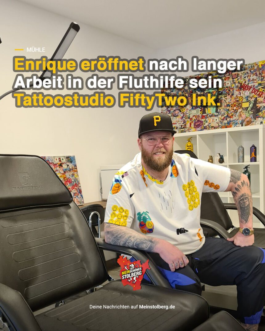 Knapp zwei Jahre lang engagierte sich der 37-Jährige mit seinem Verein „IG Mühle für Stolberg“ in der Fluthilfe vor allem im Bereich Unterstolberg. Jetzt möchte er im Verein kürzer treten und sich mit „FiftyTwo Ink“ seinen Traum vom eigenen Tattoostudio erfüllen.