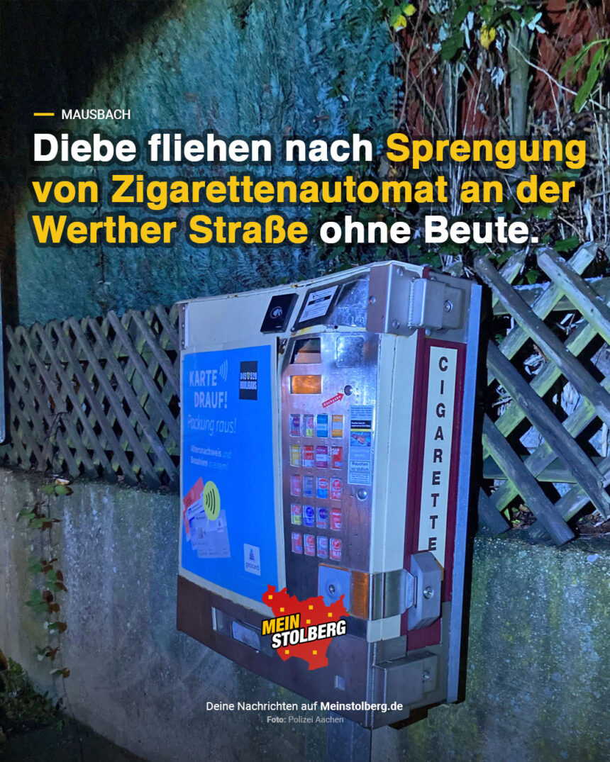 In der Nacht von Freitag auf Samstag haben unbekannte Täter im Stadtteil Mausbach einen Zigarettenautomaten an der Werther Straße gesprengt. Die Täter konnten keine Beute machen und flüchteten schließlich unerkannt…