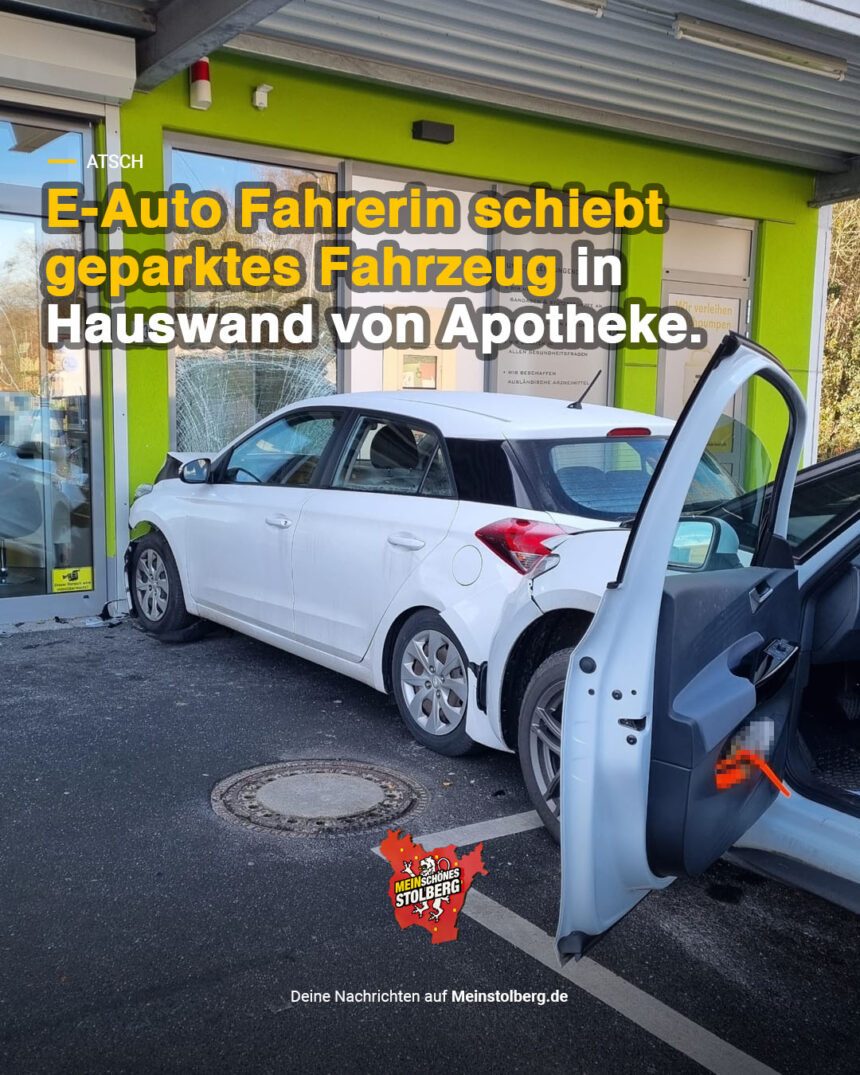 E-Auto schiebt geparktes Fahrzeug in Außenwand der Engel Apotheke