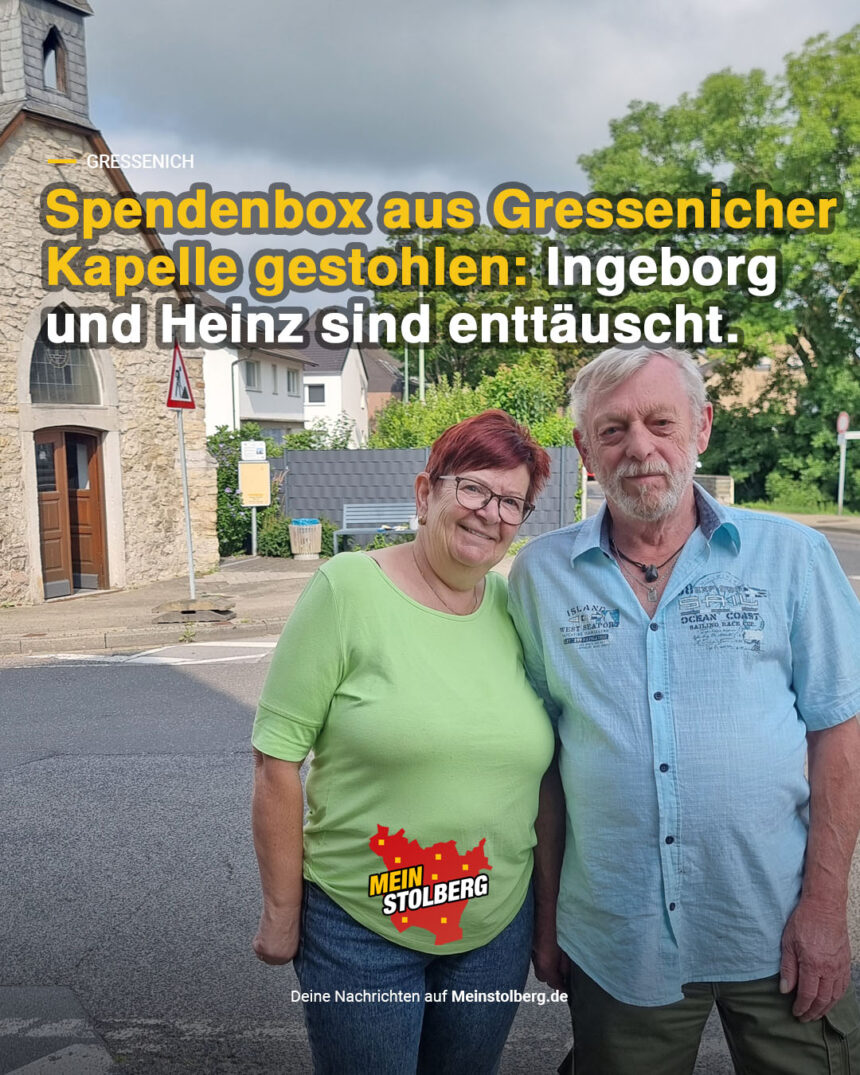 Seit über fünf Jahren kümmern sich Ingeborg und Heinz Wenzler gemeinsam mit Familie Dovern liebevoll um die kleine Kapelle in Gressenich – doch vergangene Woche mussten die beiden eine wirklich ärgerliche Entdeckung machen. Als sie wie gewohnt am Freitag zur Kapelle kamen, um Kerzen zu erneuern, bemerkten sie: Unbekannte hatten den Spendenkasten mit Gewalt aus der Wand des kleinen Bruchsteinhauses gerissen.