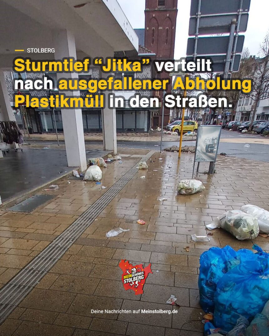 Die letzte Abholung der gelben Säcke konnte wegen des Schneefalls und Frost in vielen Straßen und Stadtteilen nicht durchgeführt werden. Das aktuelle Sturmtief „Jitka“ verteilt die liegengebliebenen Abfallsäcke und deren Inhalt nun durch Stolberg.