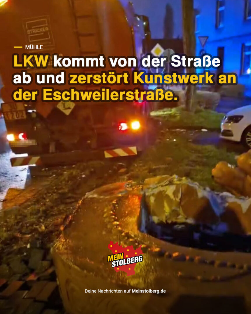 Nach bisherigen Informationen fuhr der LKW zunächst gegen eine Ampelanlage, riss Warnzeichen mit sich und prallte anschließend direkt in das Kunstwerk „Frauen für Frauen“ am Straßenrand. Die schwere Maschine konnte dabei weder von der Ampel noch vom massiven Kunstwerks gestoppt werden. Die Skulptur wurde komplett zerstört und lag in mehrere Einzelteile zerbrochen auf dem Boden. Verletzt wurde aber zum Glück niemand.